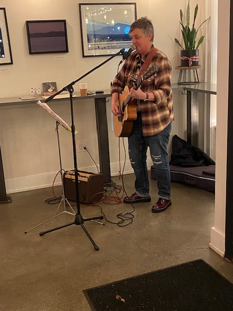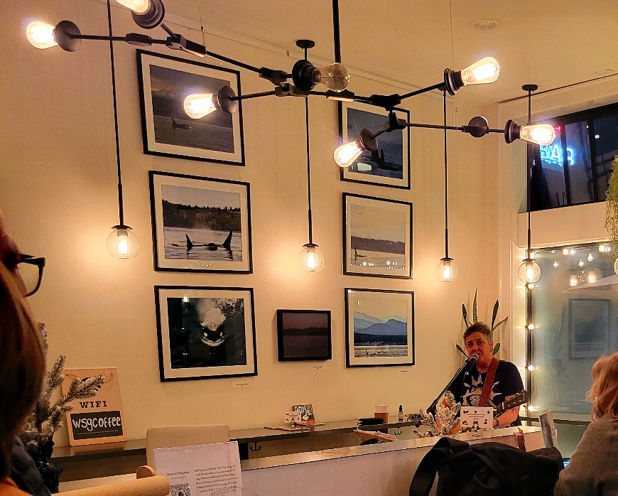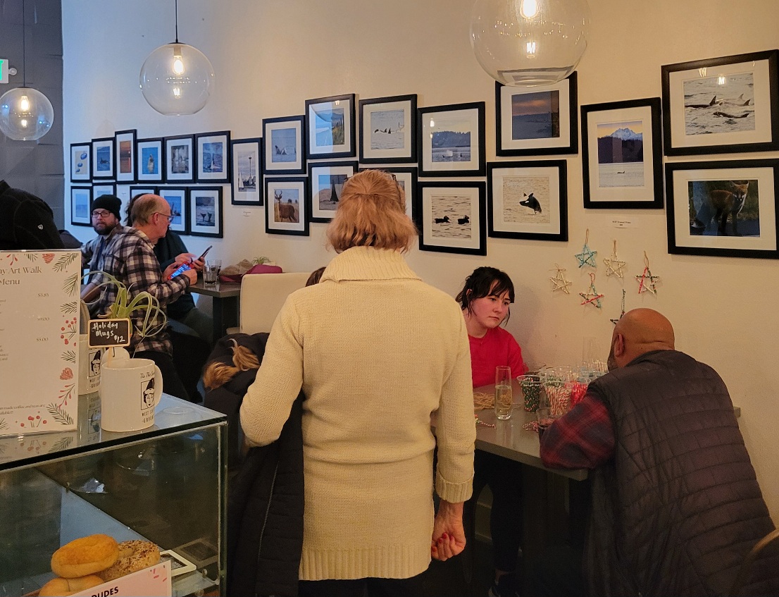 Up in Admiral district West Seattle Grounds was bustling with activities of all sorts for the final Art Walk of 2023. Guests sipped hot cocoa, coffee, and wine while enjoying the always fantastic music of local legend Sue Quigley as part of Art of Music. Brittany Noelle’s photographs of our resident orcas filled the space with friendly faces (and tails, and fins!) while we all tried our own hands at an artistic endeavor to craft holiday ornaments.