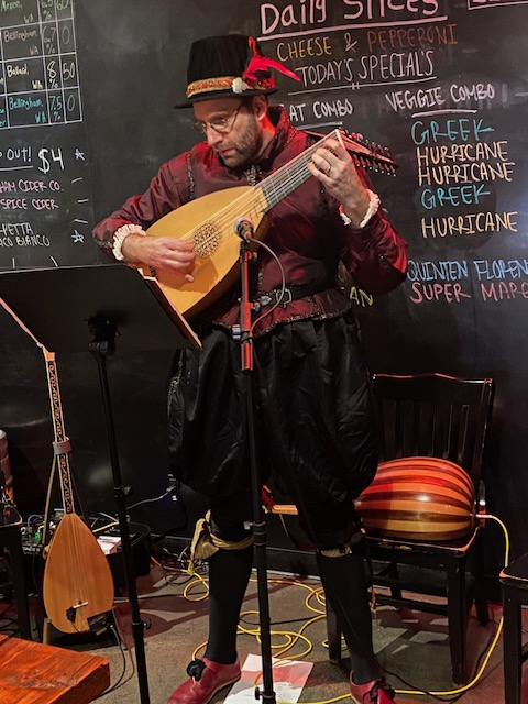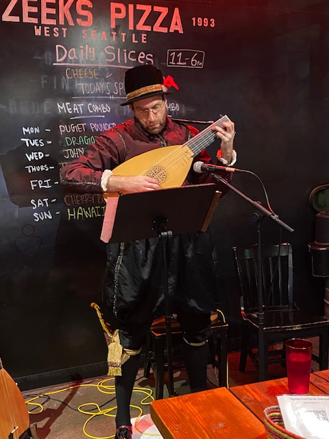 In Morgan Junction Alki Arts, a new addition to the West Seattle art scene, featured prominent local photographer Patrick Robinson’s work alongside ‘Confluence’ a group show by seven talented local artists. At The Building, an artist collective, studios were full of lively discussion and energy, with a wide array of mediums and artistic styles on display by local artists. Inner Space Designs featured Reverie by Hailey Lindsay with three-dimensional mountain peaks arising from the walls. Zeeks Pizza hosted Art of Music with musician Matt Cecil on Renaissance lute, in costume, accompanied for part of each set by his band members. Long-time friends, artist Alizah Naomi Olivas and Pine Lake Cellars owner Rob McCall were enjoying the fun and festive atmosphere of the crowd at the local tasting room.