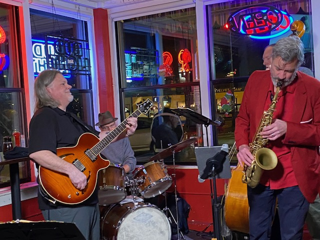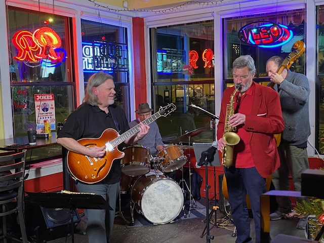 Windermere hosted an artist reception on one side and a pop-up holiday market on the other, and both sides were busy all night. The many empty wine bottles bore witness to the festive spirit of the evening! T Frick’s abstract and landscape paintings captivated many art lovers. Easy Street held a hopping pop-up market for the hip shopper. Storied Seattle entertainment photographer Karen Mason Blair took center stage as she recounted first-hand tales of the 90s music scene. Nearby, deejay Justin was spinning tunes at Jet City Labs while the pop-up market vendors did brisk business and featured Art Walk artist Maggie charmed the crowd. The Great American Diner and Bar featured Art of Music with quartet Rik Wright’s Fundamental Forces, with the tagline “like jazz, but not.”