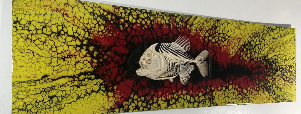 I am a Bering Sea fisherman, involved with the pollack fishery. I am very proud to part of a well regulated and very sustainable fishery. I care about conservation very deeply for all the good reason as well as livelihood depends on it. I have quite a fascination with the beautiful structures that nature gives us. I started my art journey by assembling articulated fish skeletons using only sea life that had died by incidental bycatch of commercial fishing boats. Using these creatures, I feel that it celebrates their life. Now, I secure the skeletons from top experts in the field. Steve Husky PHD at South Kentucky University has prepared most of the skeletons. Most taxidermist will not prepare fish skeletons. Of those who do there are only a very few that can make them well enough for my purposes. Presently, I am making less than 20 pieces a year, some of which are made at sea. I really enjoy creating these composition, the fluid art, working the steel and design. My objective here is to share these pieces with everybody. It really shows all creatures are beautiful and no artist can out-do natures designs. Captain PETE