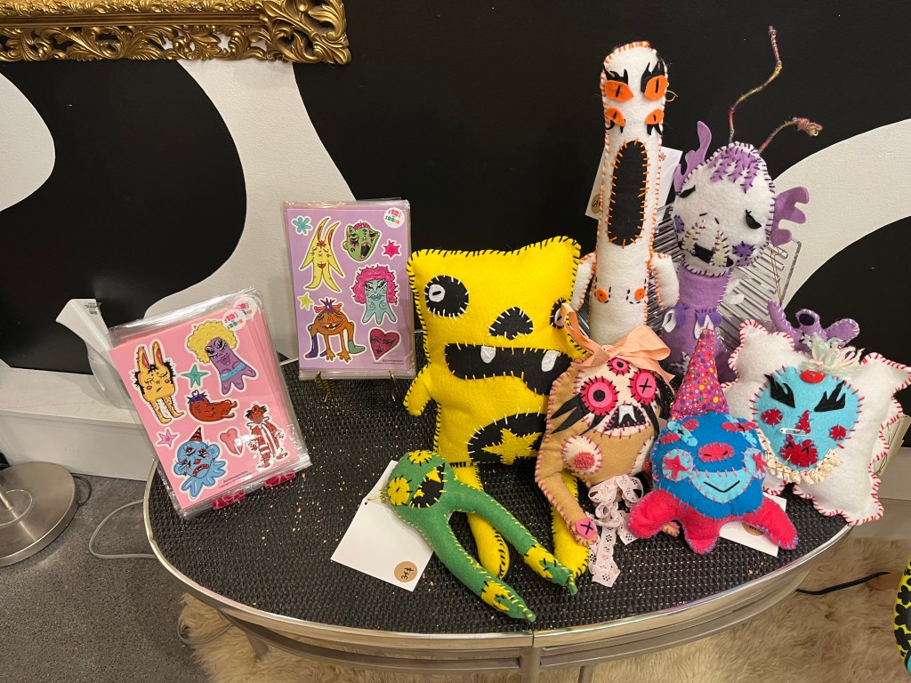 i made some stuffed creatures each with a backstory and likes and dislikes! i also made some stickers and paintings! I’ve been making art since i could hold a pencil but this is my first time having a show 🙂