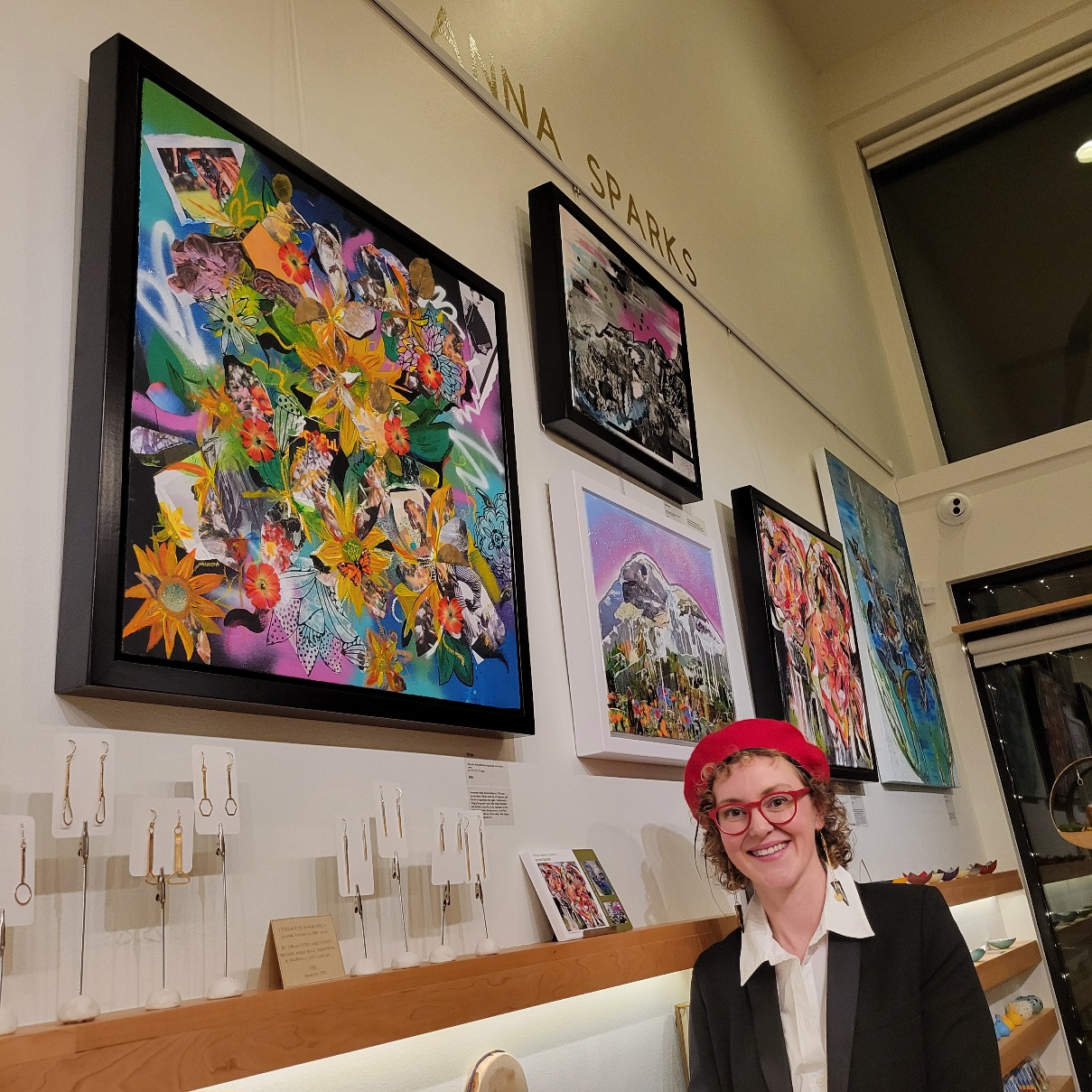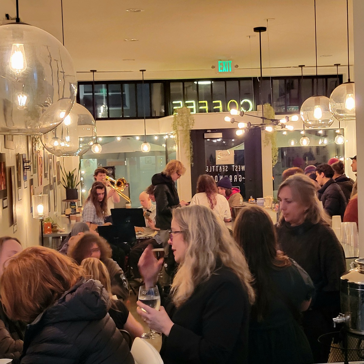 At the north end of Art Walk, the snow couldn’t stop the party at West Seattle Grounds which hosted both artists and musicians from West Seattle High School. Jazz filled the air and warming drinks flowed in the packed cafe as our community’s young ceramicists, photographers, painters, and digital artists showed off their work. West Seattle artist Anna Sparks’ collection “La Vie en Rose” lit up the space at Wend. Her collage of old Life Magazines “For Hawaii” in support of the Peoples Fund of Maui drew the eye while her Pacific Northwest landscapes grounded the crowd in our local beauty.
