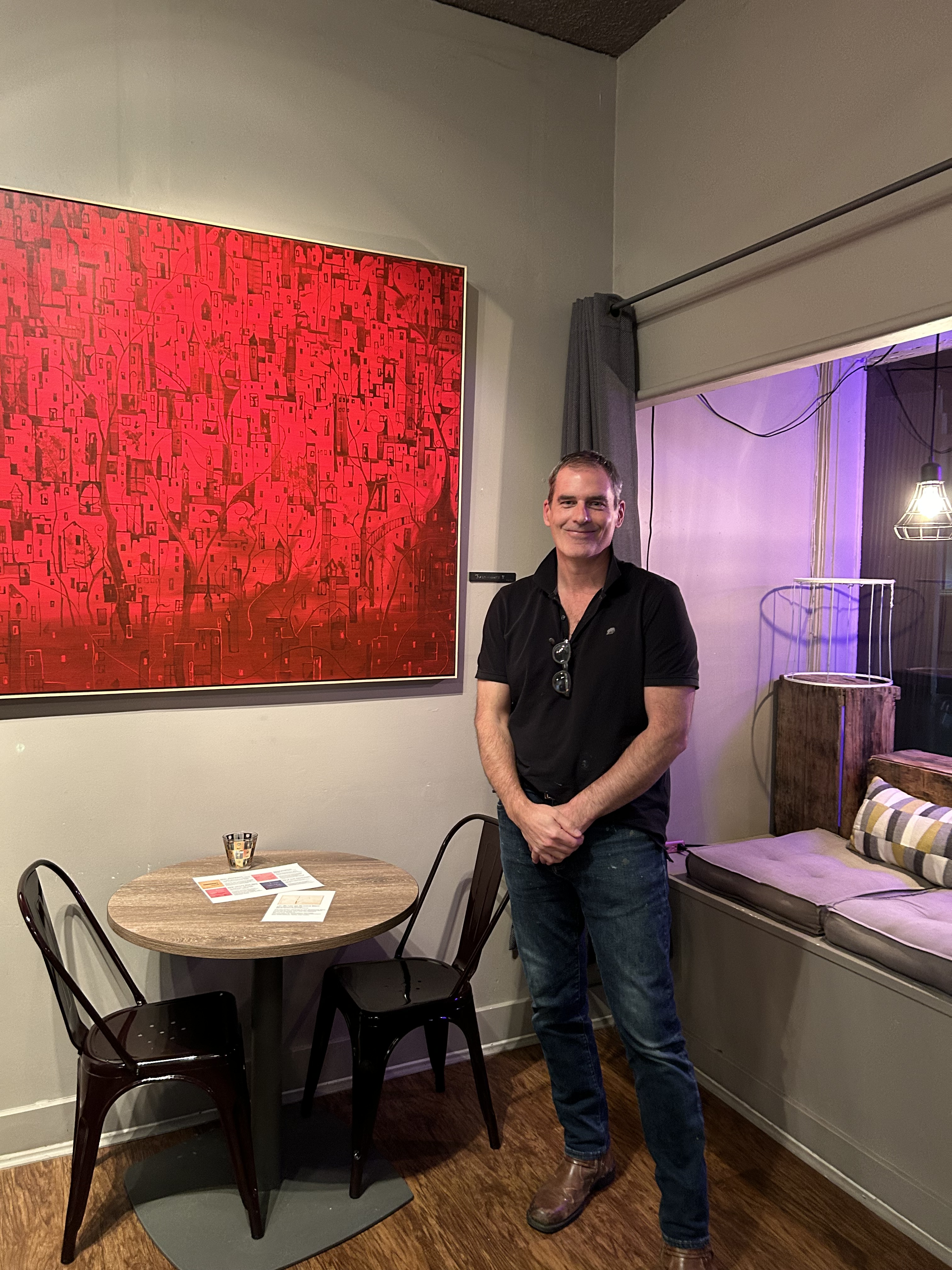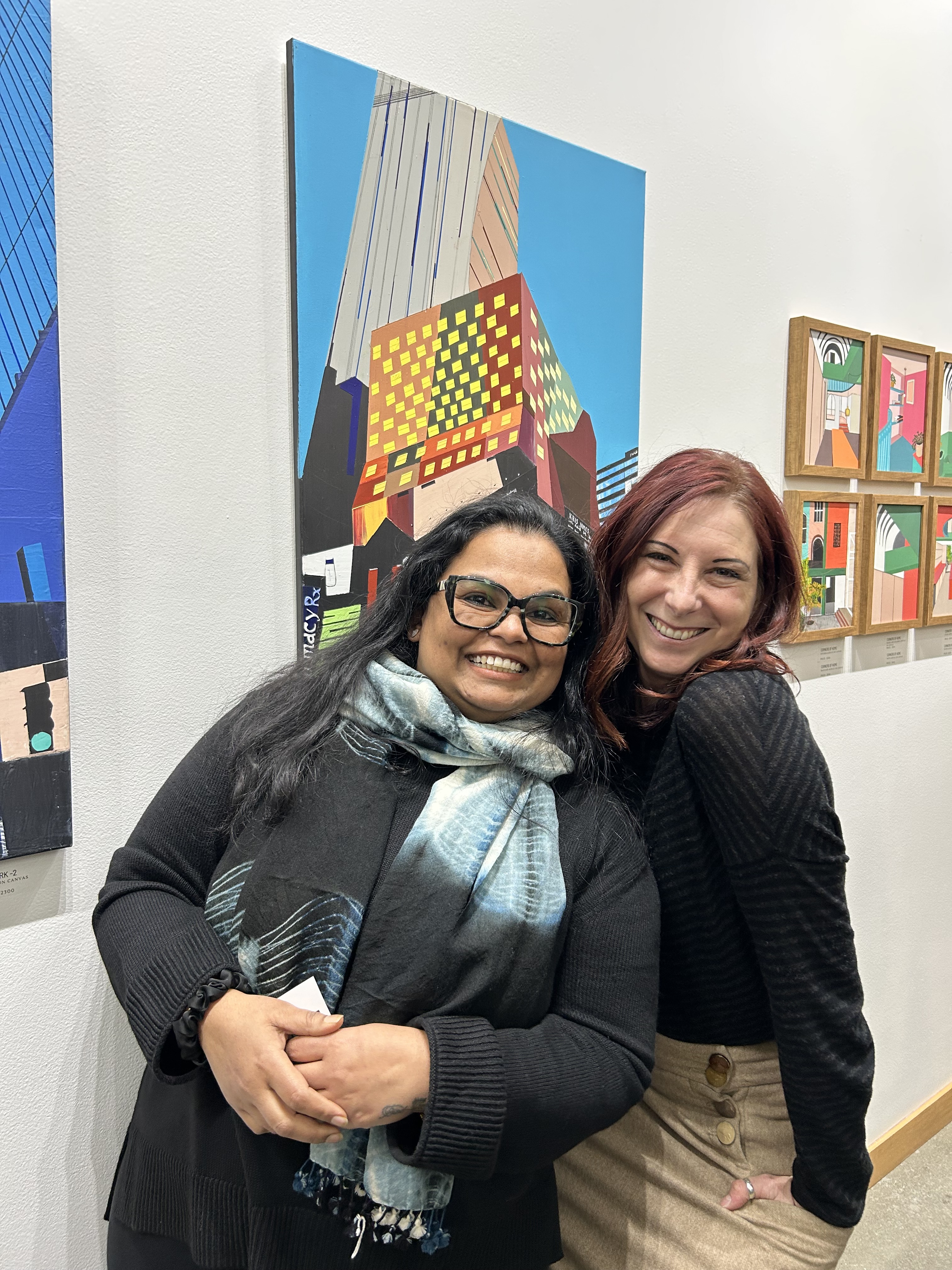 Michael A. Knutson’s stunning paintings were on display at Viscon Cellars where a number of guests were enjoying wine with their art. The cozy wine tasting was a welcome stop on a cold and snowy Art Walk night. Inner Space Designs was hopping! A lively crowd assembled to check out Anamika Venkatesh’s vibrant, architecturally inspired paintings. The bright colors provided a spark of joy and a wonderful contrast to the winter night sky.