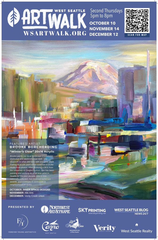 Featured Q4 Artist! Congratulations to our third quarter featured artist, Brooke Borcherding. The West Seattle Arts Council loved her use of color and abstract shapes to capture our city and Mount Rainier. She will be the featured artist October 10th at Inner Space Designs, November 14th at Alki Arts and December 12th at Verity Credit Union.