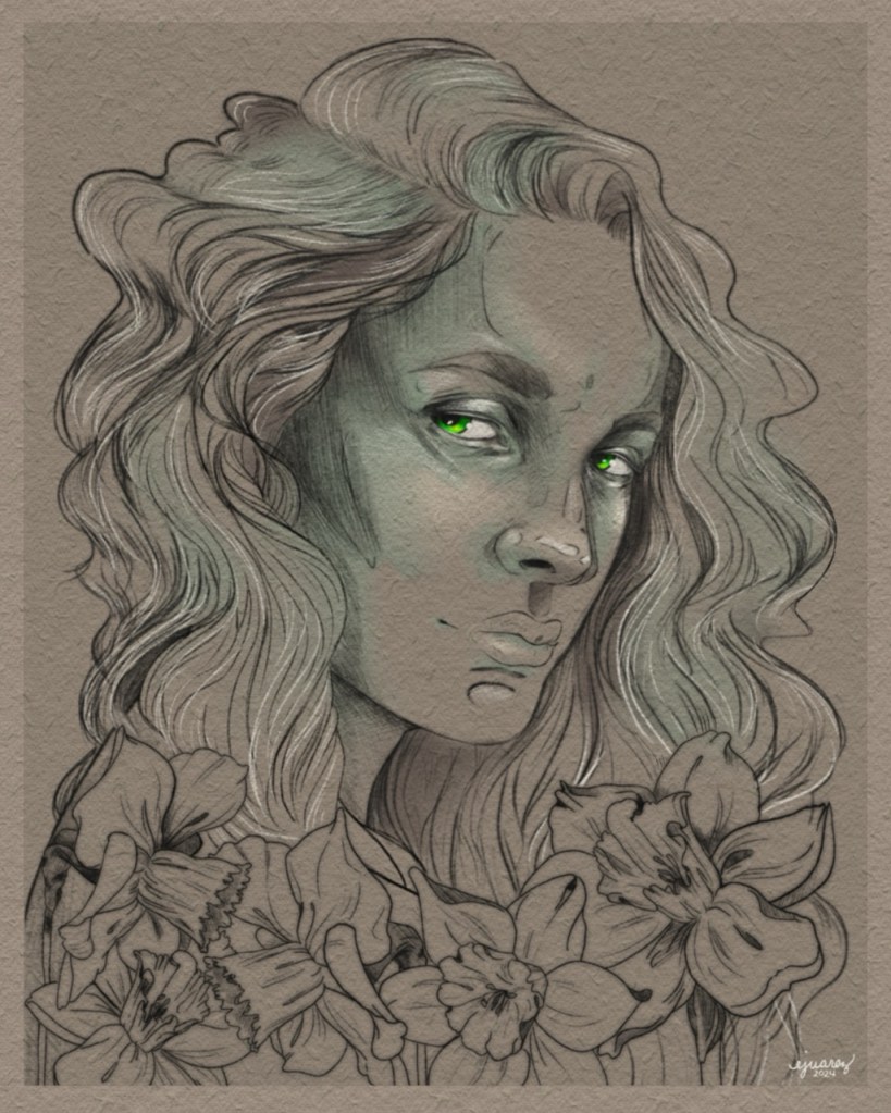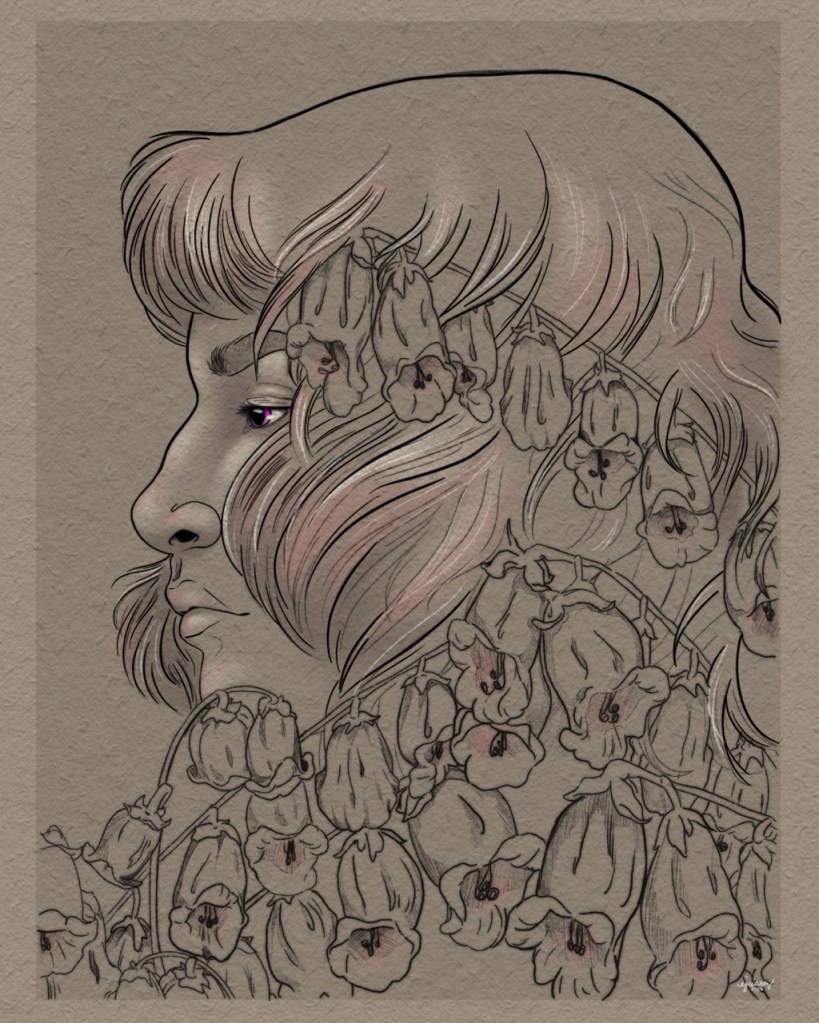 The first piece I created in this series is “Dandelions”, which are like suns growing beneath our feet, and was inspired by my own mother’s love, support, and warmth. Those in my life who show compassion to others inspire me greatly. In gathering references for these pieces, I let these feelings guide me: strength, guidance, and protectiveness. My hope is that as you view these drawings, you will feel the same strength from the women and flowers depicted. May you take in the perseverance they each display to stand tall, continue to grow, and Live Tenderly. The artist, Emily Juarez, lives in West Seattle. Emily works with local pups and coffee beans. She’s a lifelong artist, wanderer and silly goose. When she’s not creating art pieces, Emily spends her time with her partner and pup, Ben and Finch, making music, playing video games and dog training the local canines.
