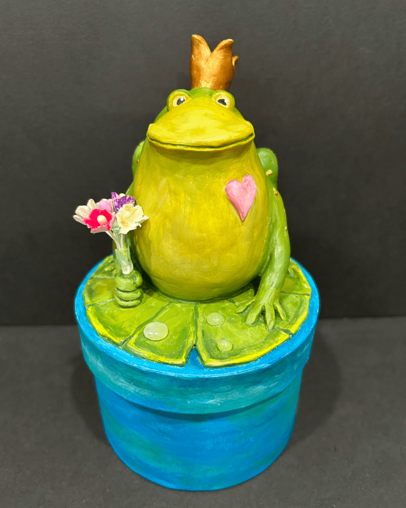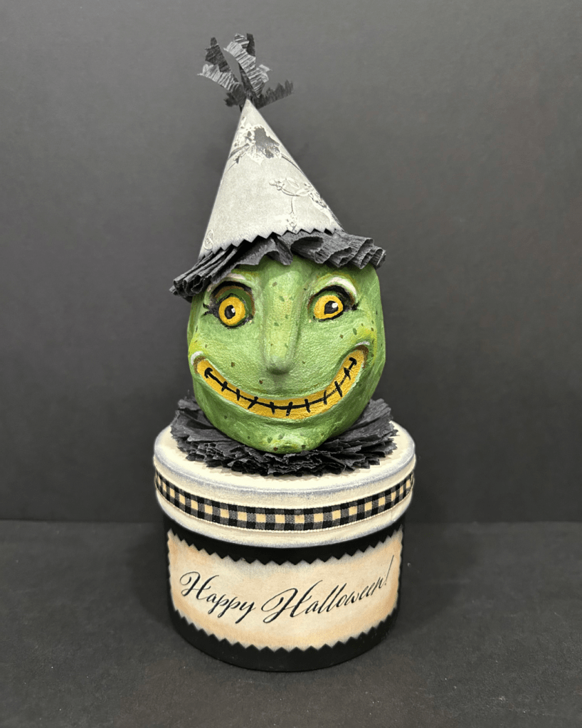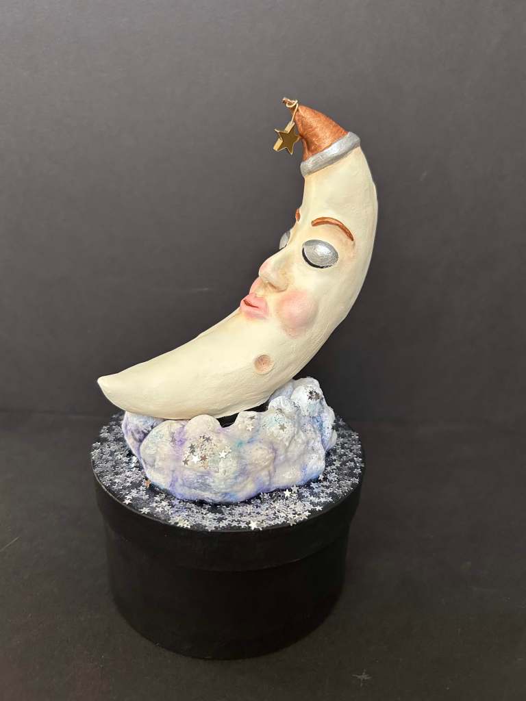 I am a papier-mâché artist. All of my pieces are one of a kind, individually conceived, constructed and painted by me. Each Whimsy is lovingly crafted with many hours of care, imbued with it’s own personality reflected in its’ name. Their name is written on the bottom of their box, signed with the year they were created. I also include a story about each Whimsy on a scroll inside their box. Many are embellished with vintage ornaments and images.