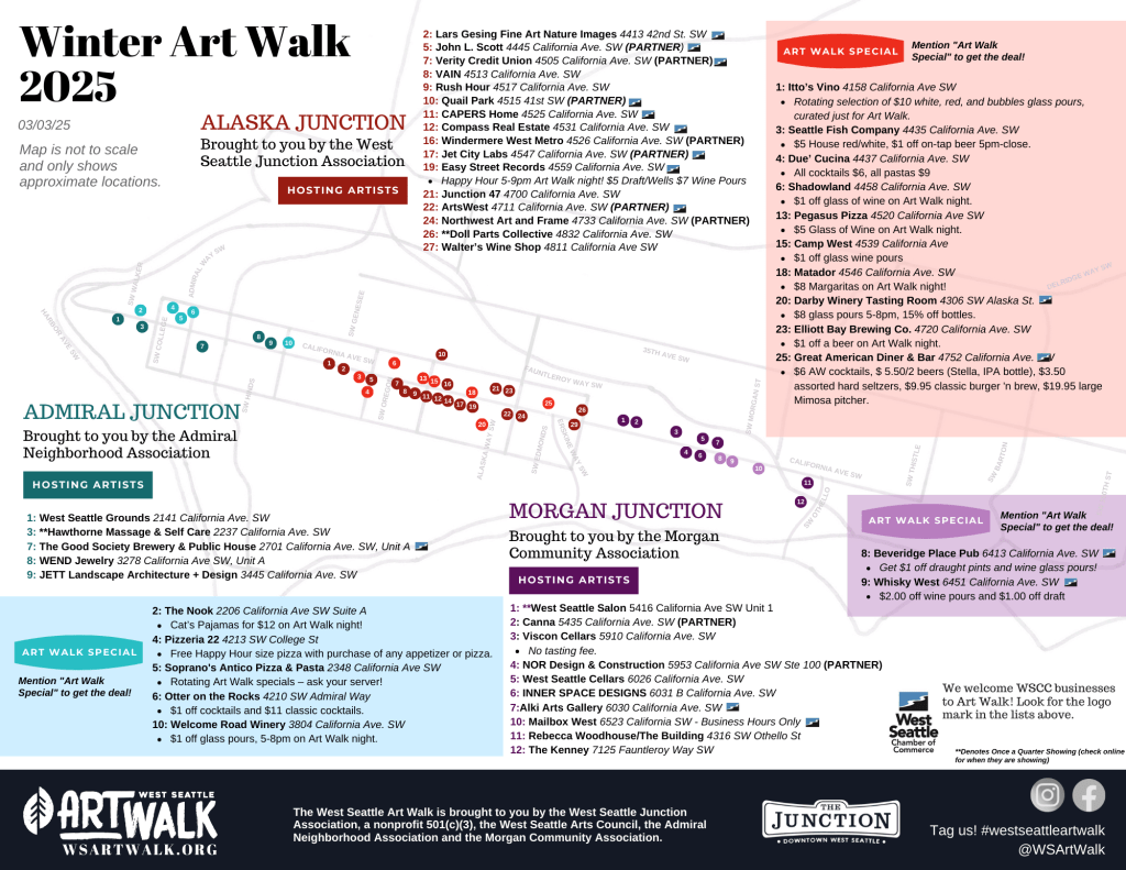 Whether it comes in like a lion or a lamb, make sure you mark your calendars to join us Thursday March 13th for the West Seattle Art walk! Grab some snacks and a glass of wine to enjoy art from all of our amazing local artists who are showing at over 40 participating businesses. Also, make sure to enjoy a wide variety of “Art Walk Specials” at 20 cozy bars, restaurants and cafes (see map below) while viewing the evening art walk.
