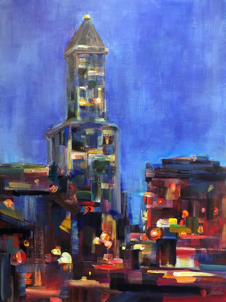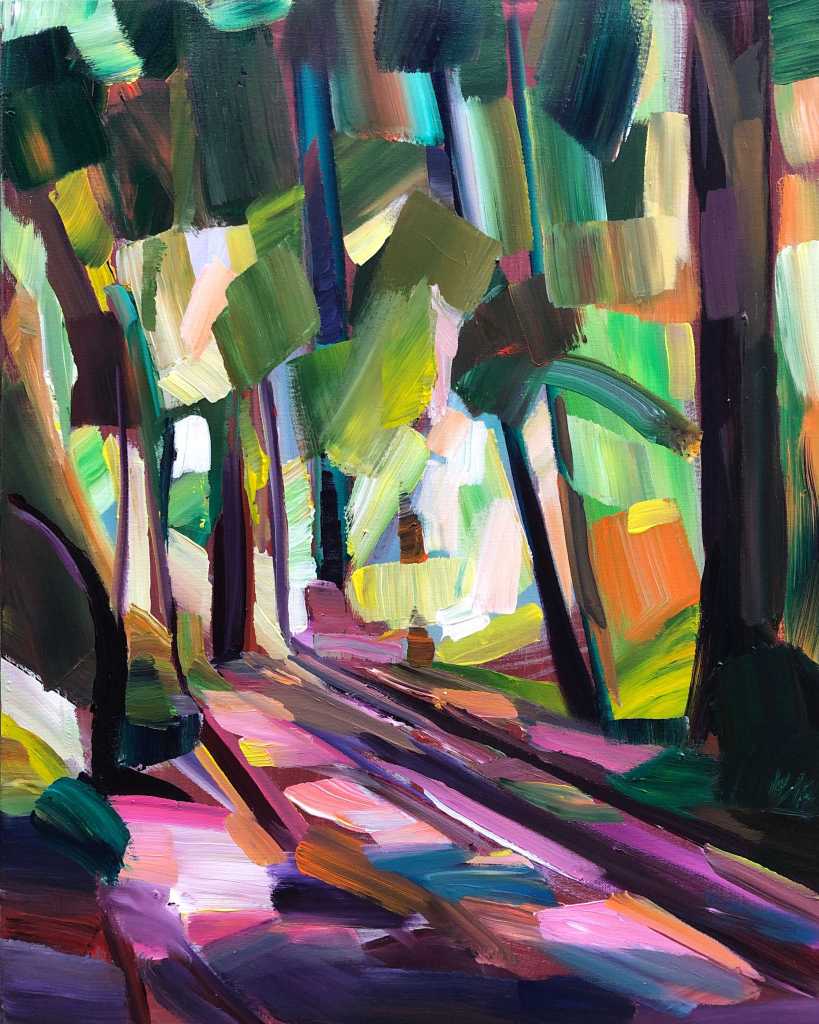 Brooke paints our local landscape in a colorful, distinctive and deconstructive style. She responds to what she sees with energetic broken-color mark making in acrylic paint either outdoors or in the studio from photos. After receiving a BFA from the University of Oregon in 2010, she has been painting and working as a full time artist in Seattle for the past decade. She is now nationally collected, has received numerous awards and continues to participate in neighborhood art walks.