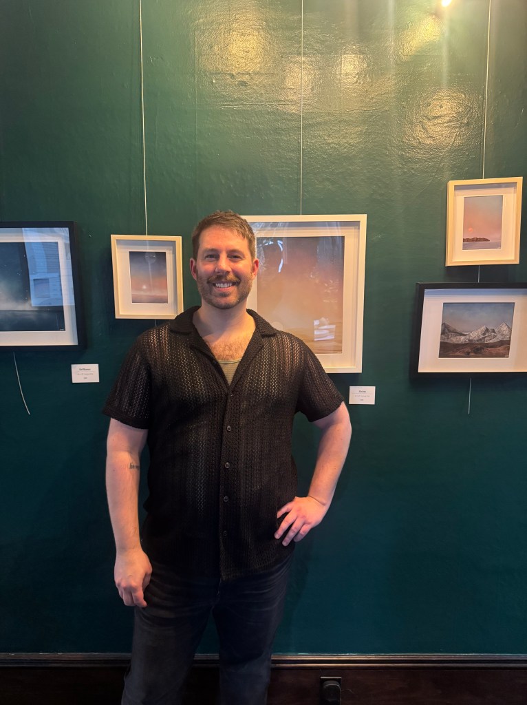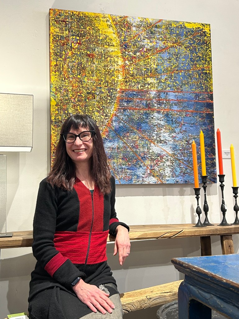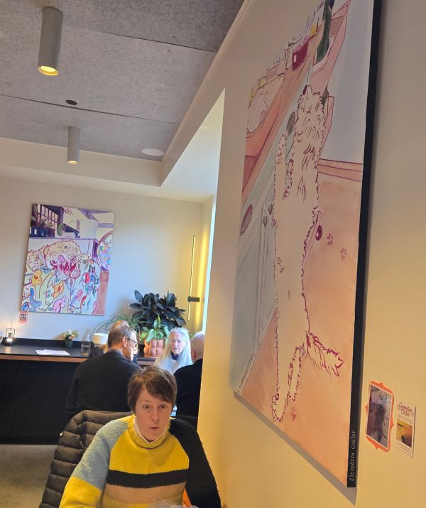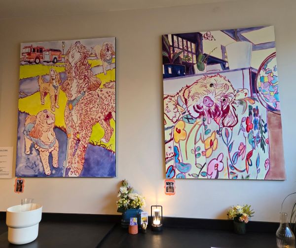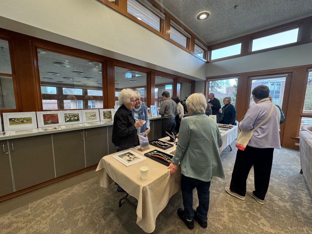 The stunning work of Brooke Borcherding at Verity had a steady stream of visitors all evening. Brooke’s vivid forests, cityscapes, sailboats, and even a painting of California Avenue drew many admiring viewers.