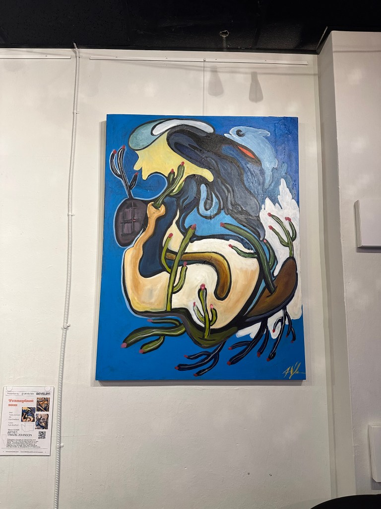 In Alaska Junction, Jet City Labs was hosting a grouping of artists that all showcased the many ways they grew up. The artist’s cousin was there talking about his show- and pointed out the many ways in which Southern California influenced his paintings.