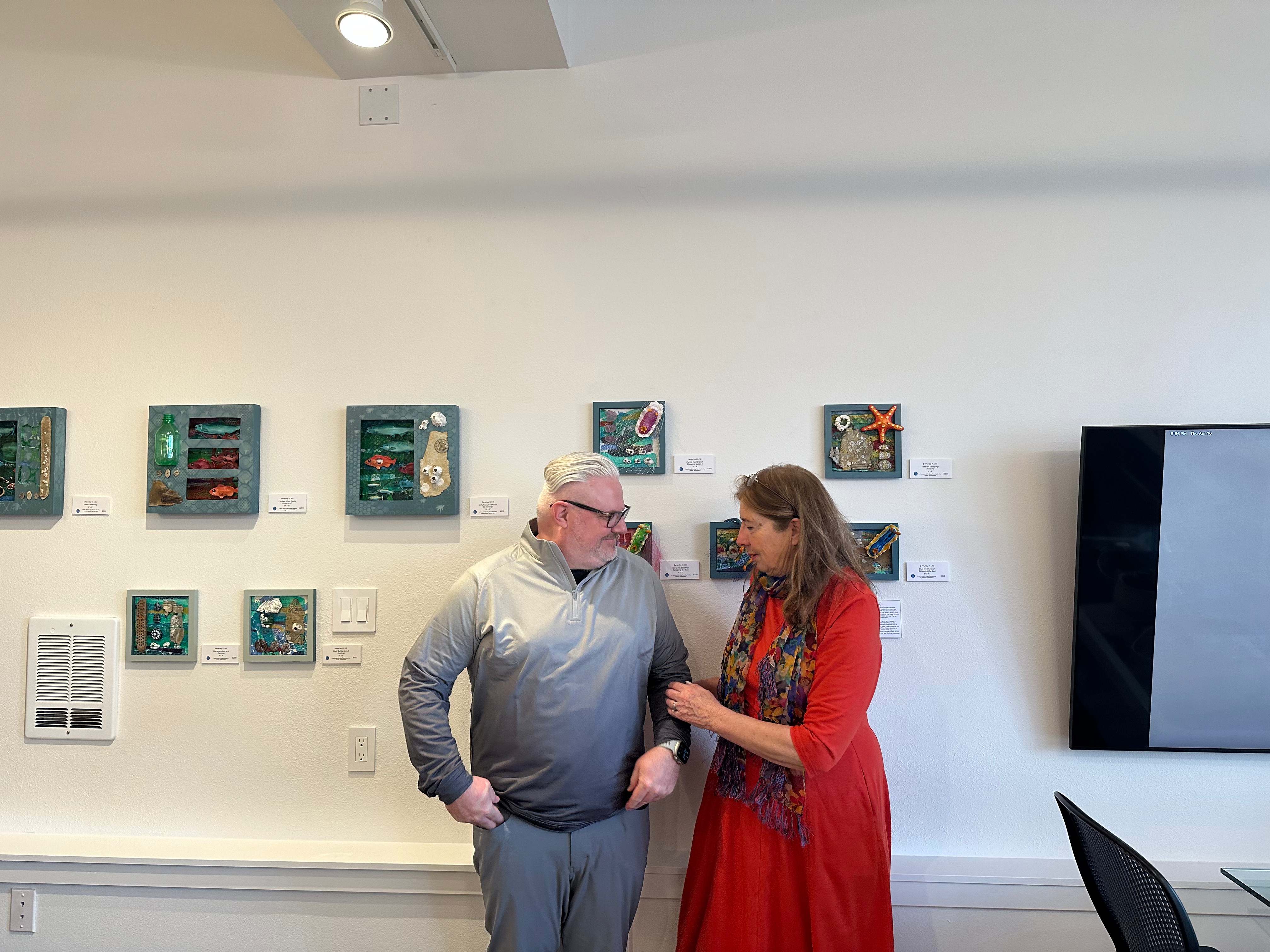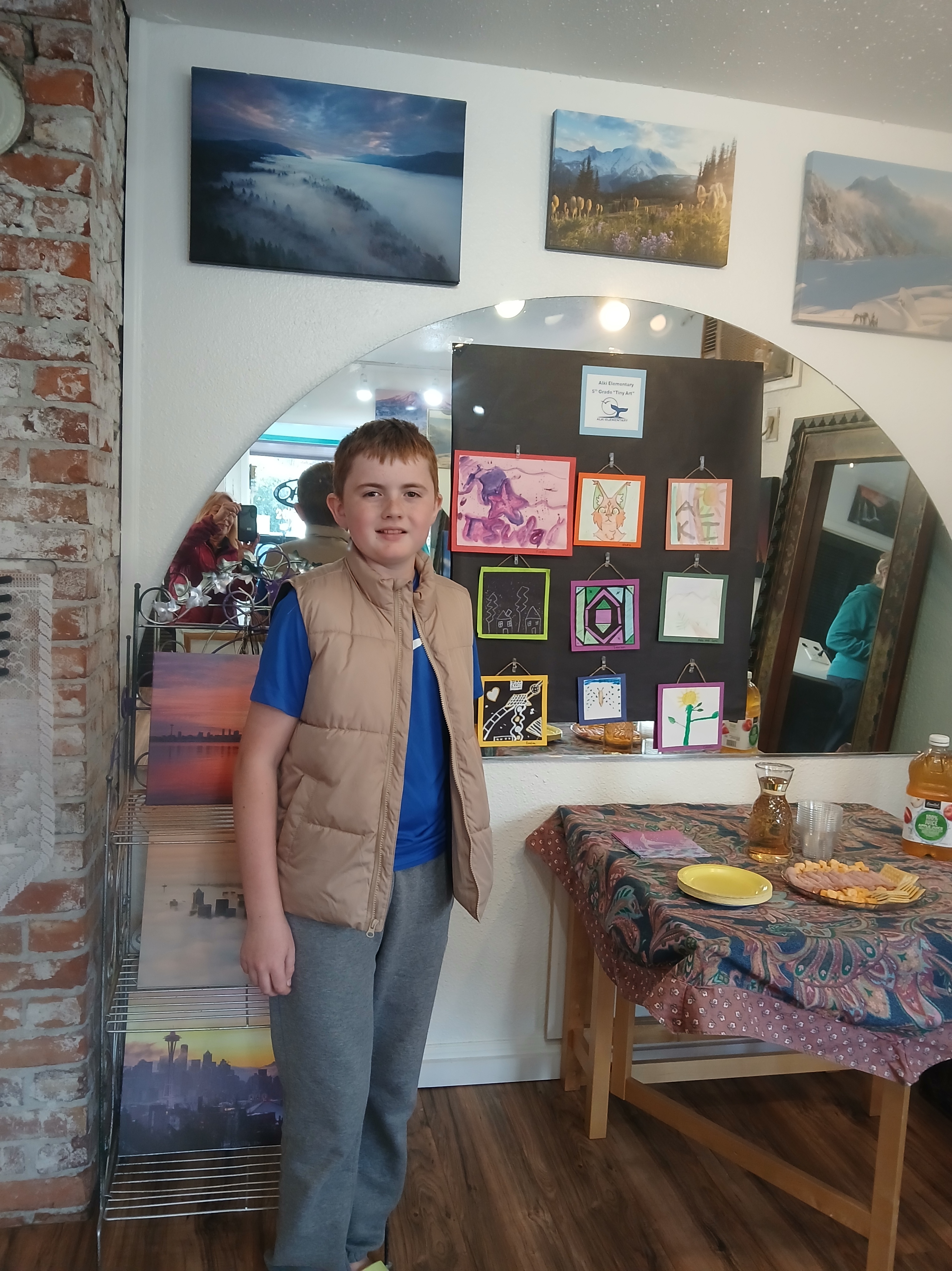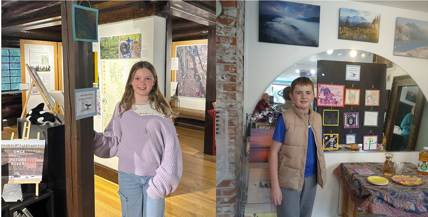 Log House Museum had volunteer for both art walk and Alki Community Council, Jessica Santana, greeting you as you walk in. The artwork by Alki Students was interspersed with the historical artifacts of West Seattle’s history. Students entering were excited to hunt for their work, with many enthusiastically talking about how they came up with their image.