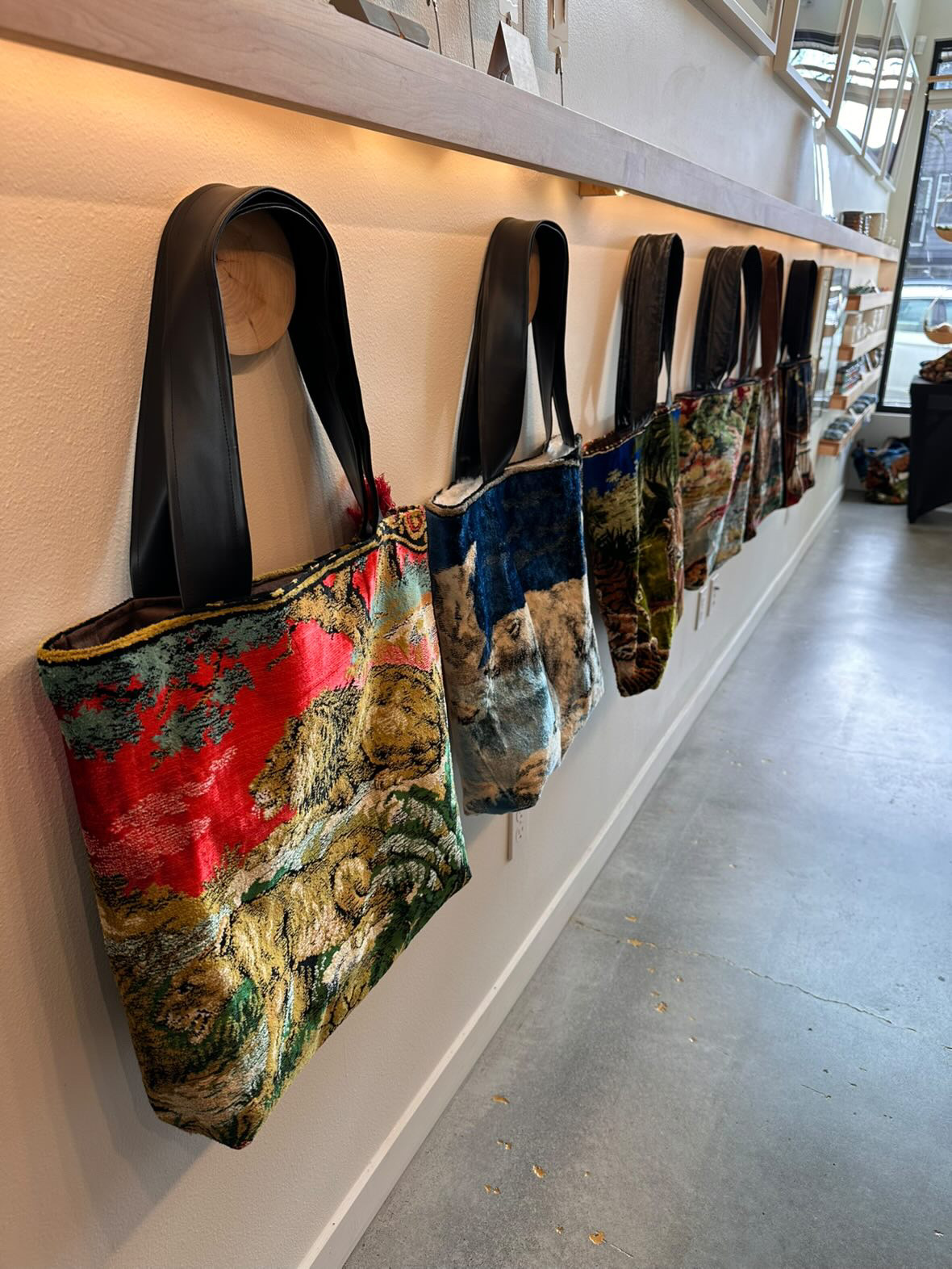 And, in Admiral, at WEND, long time art walk artist, John Woodruff displayed new work, displayed in almost rainbow pattern, is different from his previous work yet still shows his very unique style. WEND also featured a pop up for designer Kim McCormick’s upcycled tote bags, on display all month long!