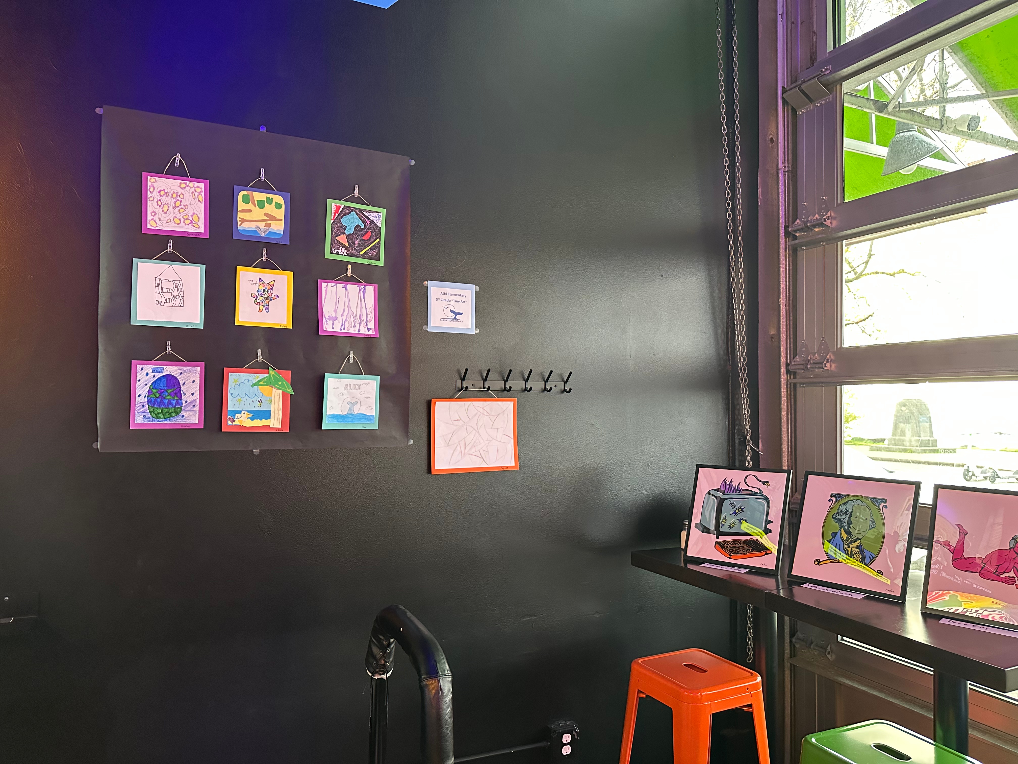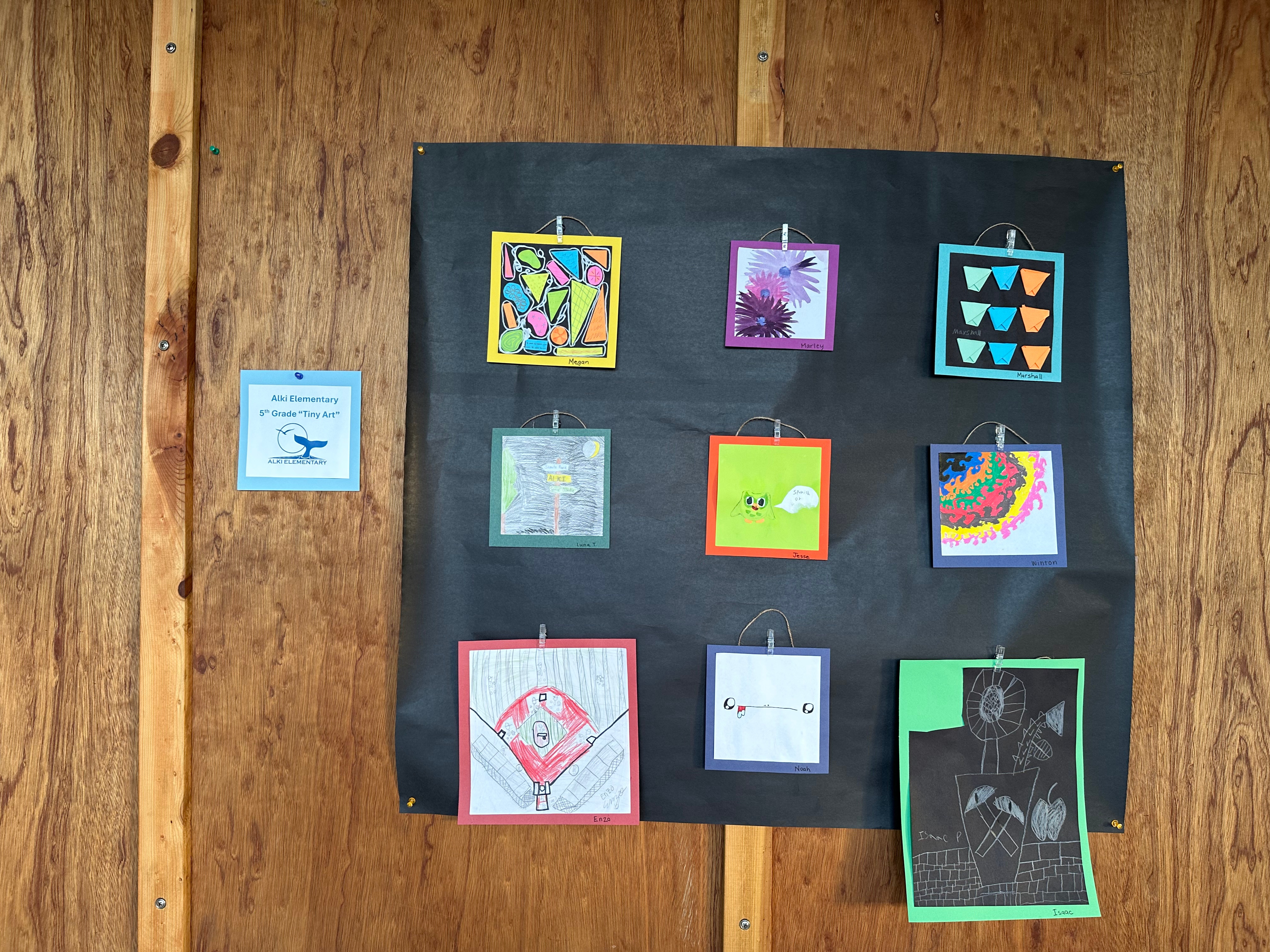 Blue Moon Burgers included work from Alki 5th graders. Each “mini art” piece was unique to each student, and each showcases the unique abilities that kids have for art – they see the world from a different perspective, and it’s refreshing to see young artists excited to find their work.