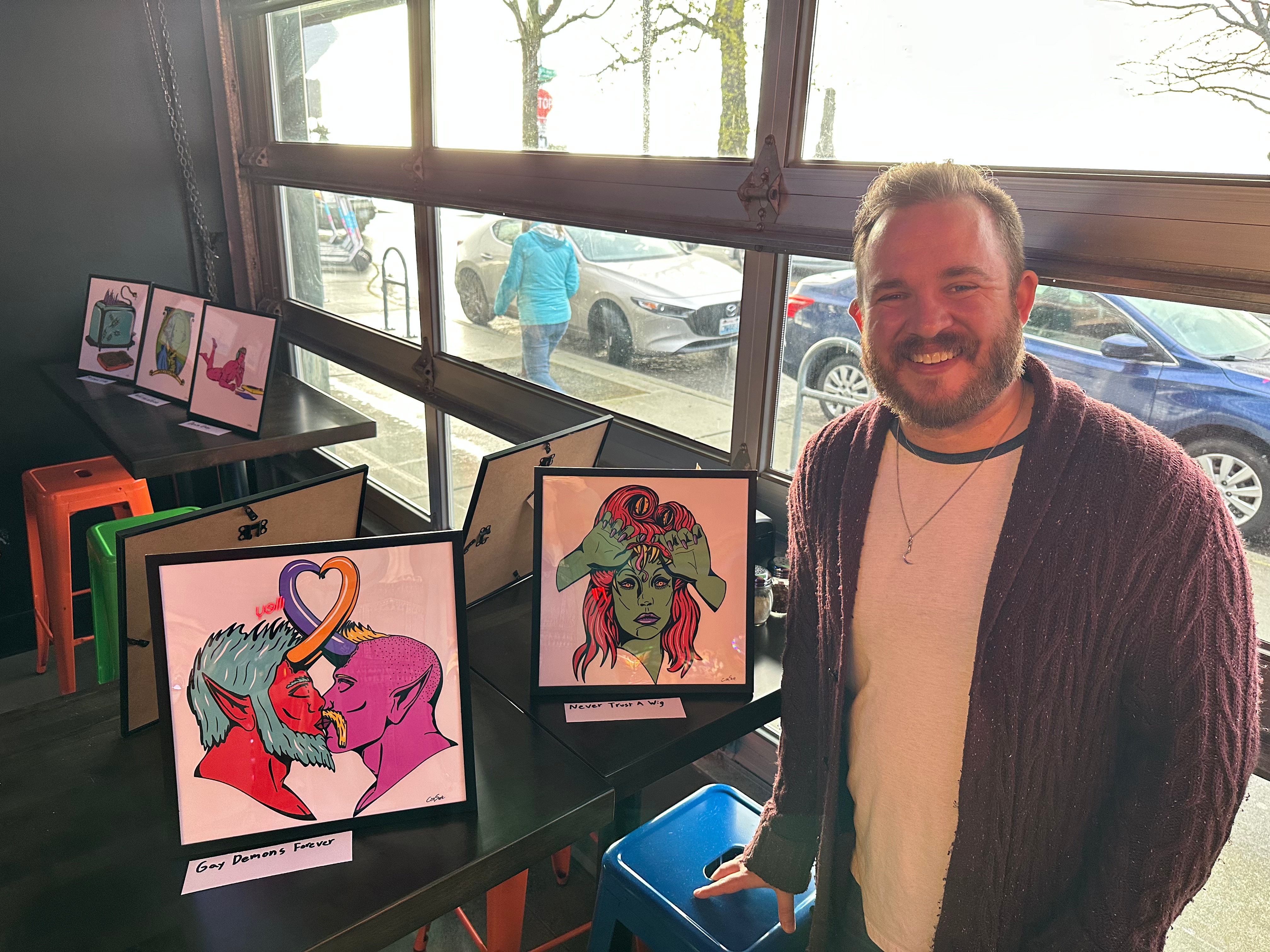 Windermere, an Art Walk Partner, had work by Kirkland artist Ethan Jack Harrington, who has a truly unique style. His work included oil paintings of both places in seattle, people in seattle, and snack reminders of your childhood. He also had bags for sale with several of his paintings printed on them.