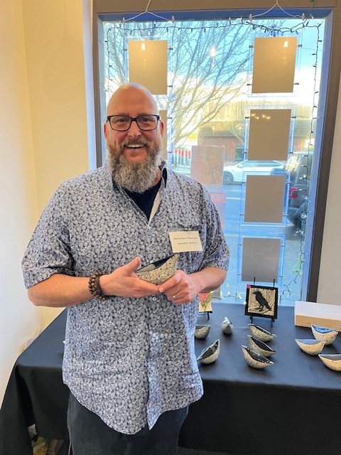 At John L Scott, there were two artists represented. Rod Guavara creates art from recycled materials. He has been doing this for about 10 years and calls himself a “self-discovered artist”. He typically takes two canvases and creates strips and weaves them together and then paints on top of them. Christian Pearson had ceramic birds on display, which is what he is most known for. He starts with a clay pot then shapes it into a bird and it feels right in his hand. He’s been doing this for 25 years. The birds are really weighty and feel really cool in your hand.