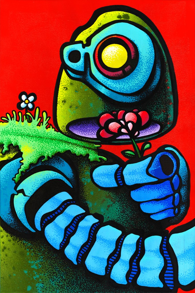 ModiMakes is a Pacific Northwest native who developed a love for art and imagery from a young age. He decided at age 9 that a professional artist is all that he wanted to be. This passion led ModiMakes to work through a variety of styles and subject matters but through everything an obsession with portraiture, iconography, and character design emerged. He combined these three core elements into his signature style that typically depicts a bold central figure in the midst of action or interaction. Utilizing a combination of inspirations from street art to pop art and cubism he renders these figures with bold bright colors and stark black linework for an intense high-contrast look that forces the character into the foreground of the viewer’s sight line.
