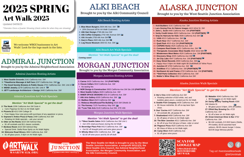 We also want to remind our Art Lovers that this event is powered by our participating artists, businesses, and restaurants. Thank you for all you do to celebrate our vibrant art scene in West Seattle!