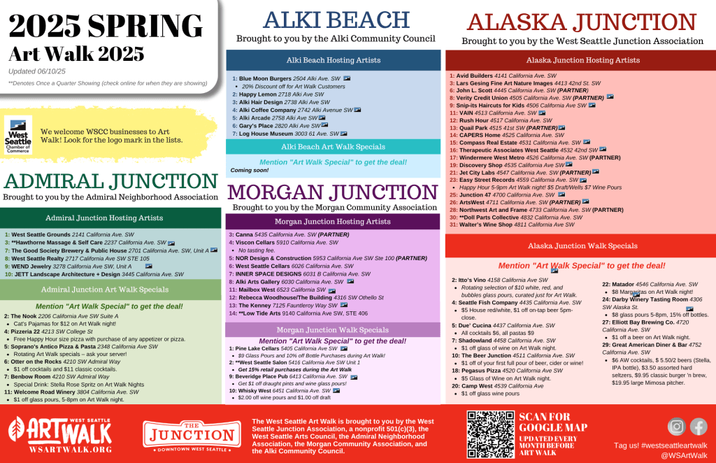 We also want to remind our Art Lovers that this event is powered by our participating artists, businesses, and restaurants. Thank you for all you do to celebrate our vibrant art scene in West Seattle!
