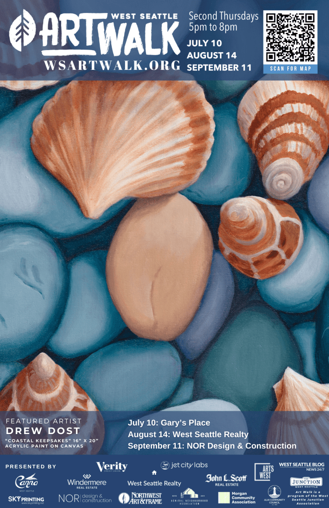 If selected, your artwork will be featured in our social media, on our printed posters displayed around West Seattle in participating businesses, and here on our website. We also strive to have the featured artist show their art all three months at businesses around West Seattle. This is a great opportunity to have your work displayed and promoted in our community, like “Coastal Keepsakes,” by Drew Dost in Q3!