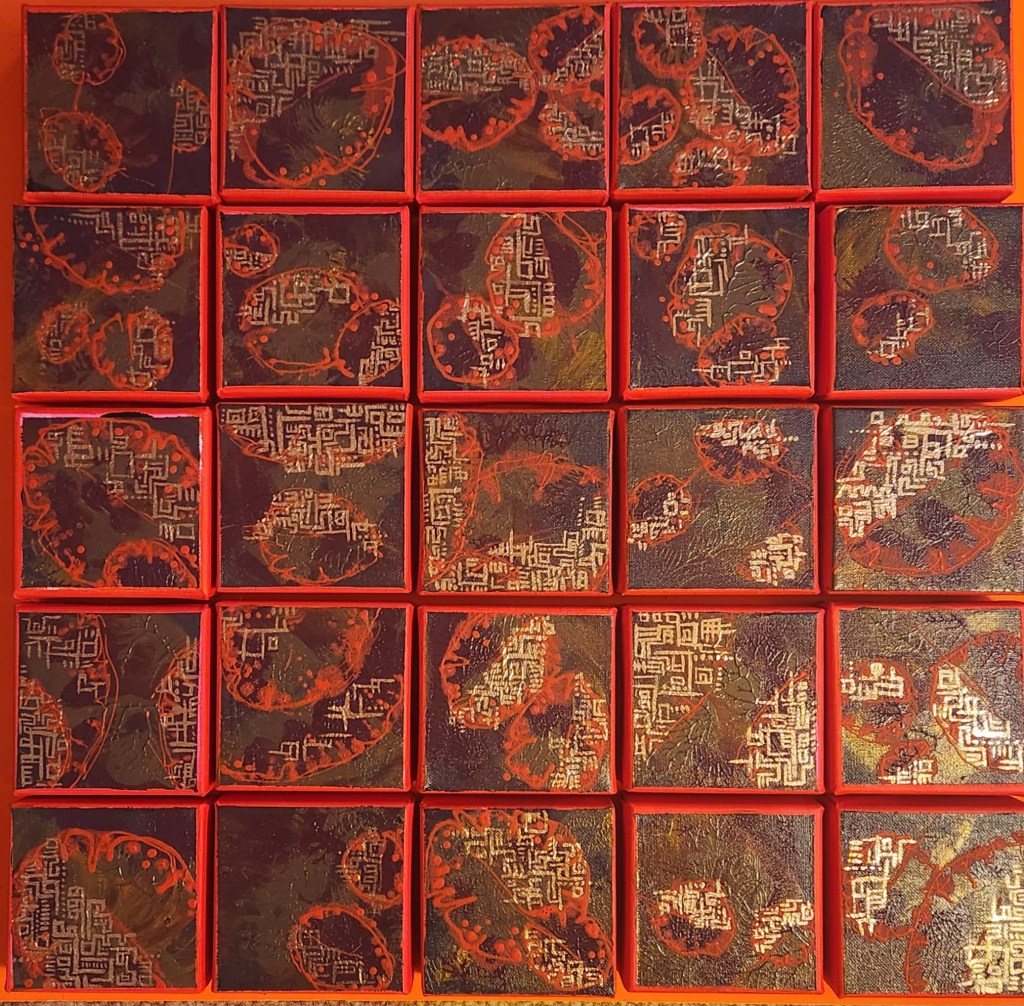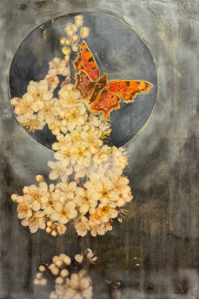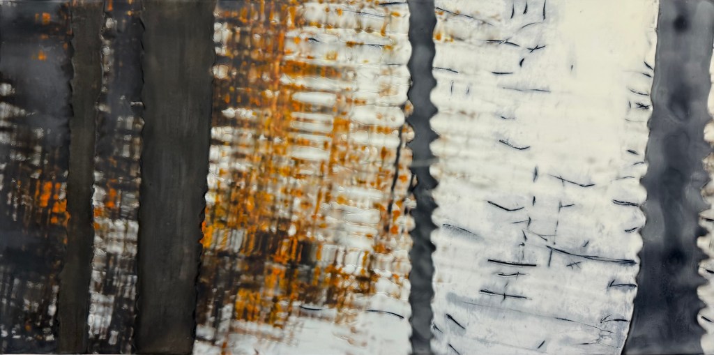 Sandy works with encaustic wax on wood panels. Come see her intricate and enchanting pieces.