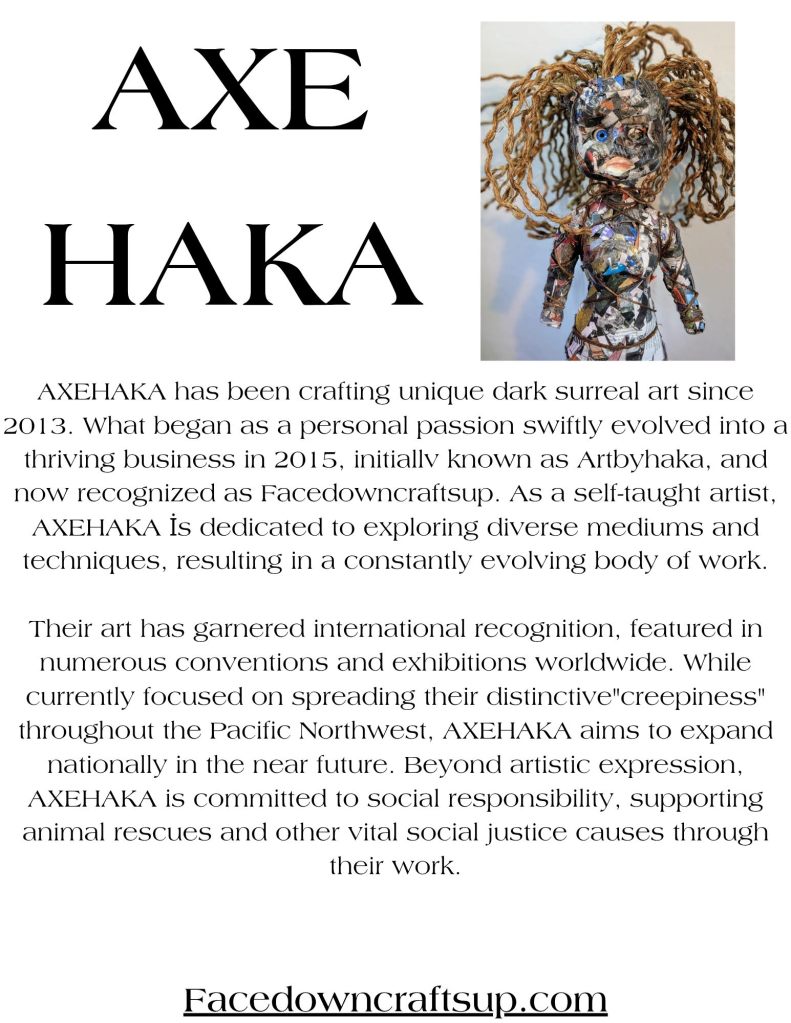 Their art has garnered international recognition, featured in numerous conventions and exhibitions worldwide. While currently focused on spreading their distinctive “creepiness” throughout the Pacific Northwest, AXEHAKA aims to expand nationally in the near future. Beyond artistic expression, AXEHAKA is committed to social responsibility, supporting animal rescues and other vital social justice causes through their work.”