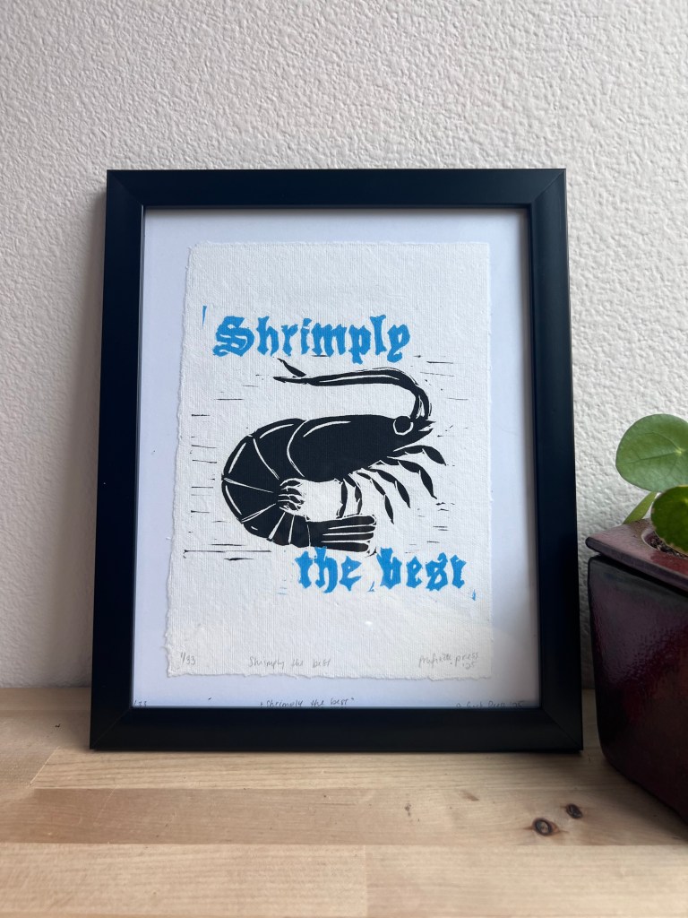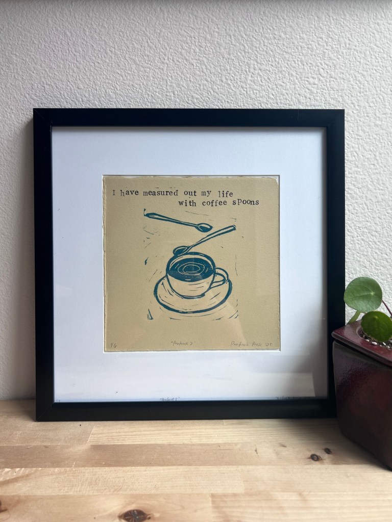 Lindsey Raker is the artist behind Prufrock Press, where she combines her love of poetry, printmaking, and often — sea creatures. All of her work is designed, carved, and printed by hand at her dining room table in West Seattle.