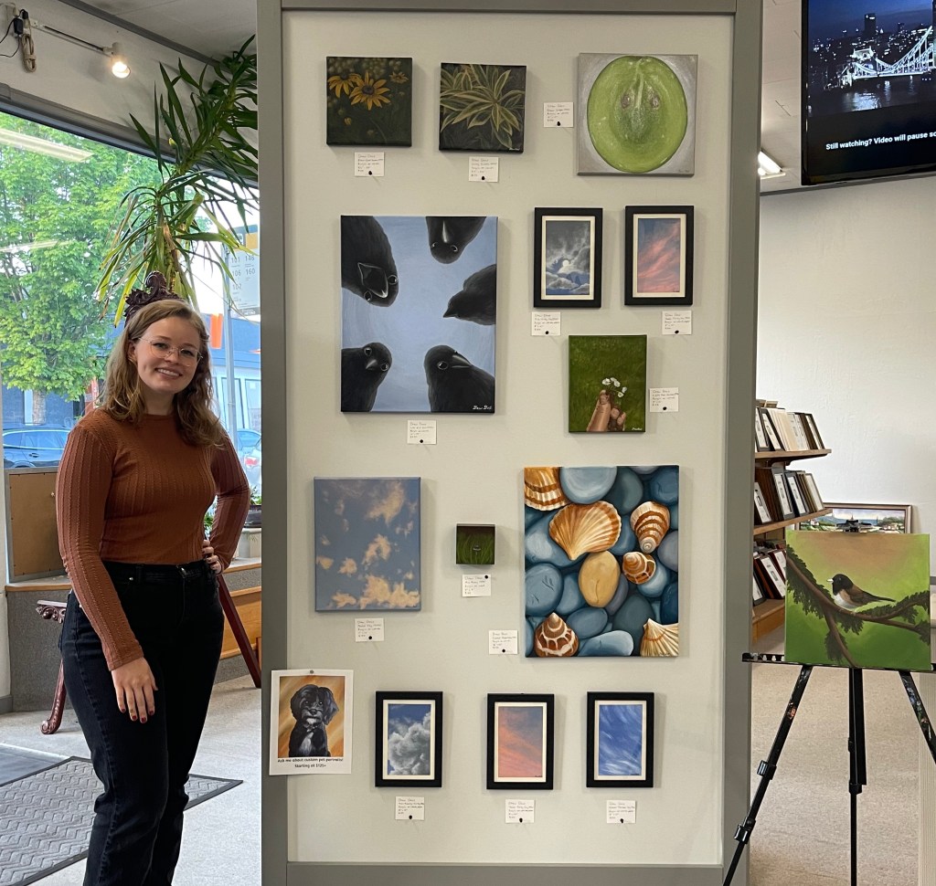 Drew Dost is a painter based in south Seattle, Washington, known for her nature-inspired artwork that highlights the beauty in everyday moments. Drew’s work spans original nature paintings, block printing, pet portraits, murals, and other public art. She has received recognition through multiple local art awards and explores themes of love, connection, growth, and wonder through her work. During this show she will be working on a carving for block printing during the art walk. Come by and see the artist at work!