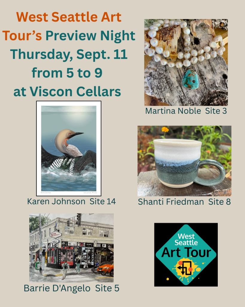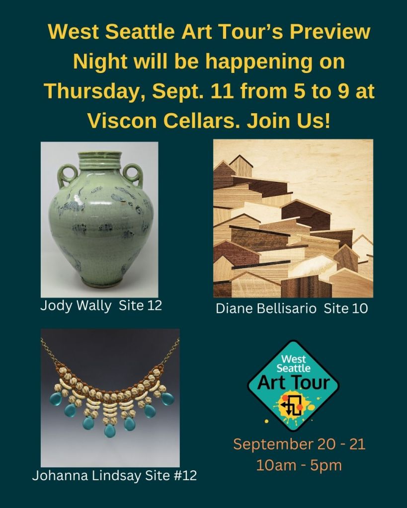 The West Seattle Art Tour will take place on Saturday & Sunday September 20-21, 2025, 10 am to 5pm! Learn more about the West Seattle Art Tour on their Website.