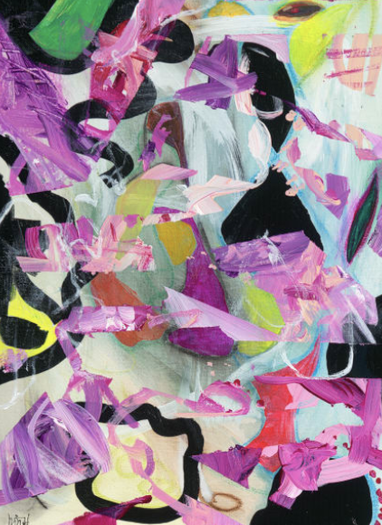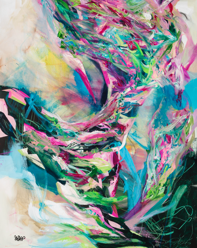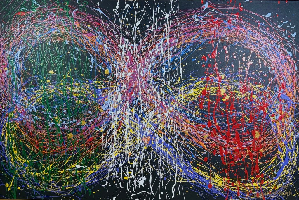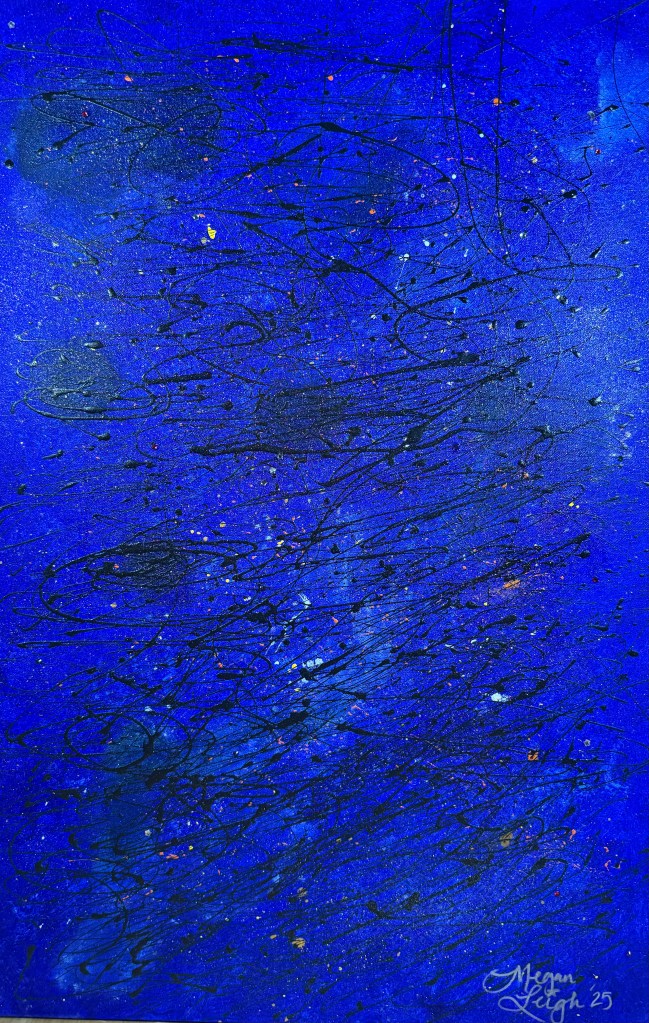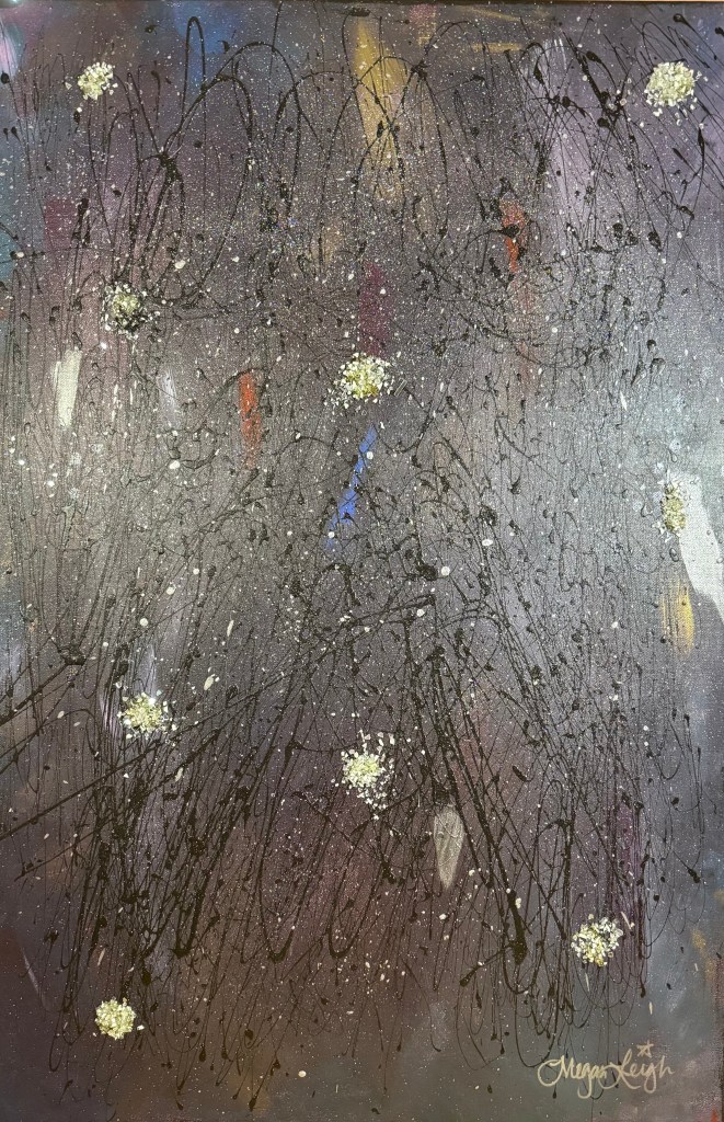 Megan Leigh is an abstract artist who lives in West Seattle and is inspired by the work of Jackson Pollock. Megan or “Meggie” as she is more commonly known as, is married and has two children, two cats and two dogs.