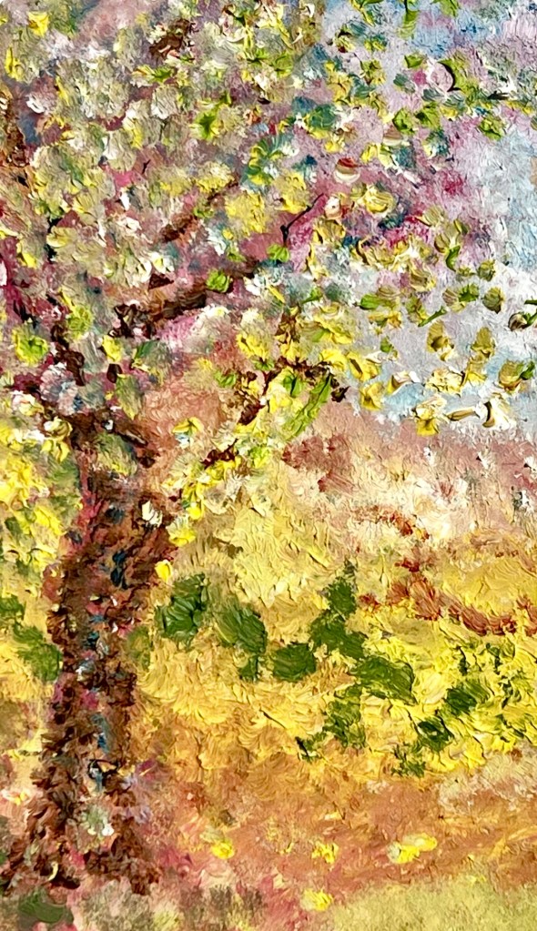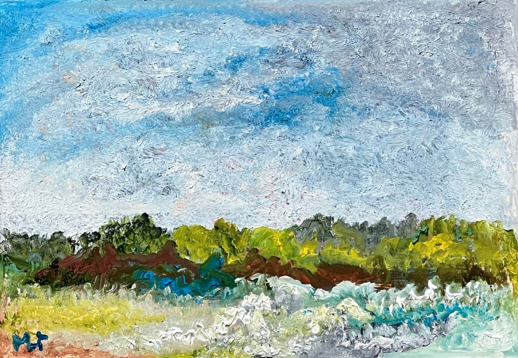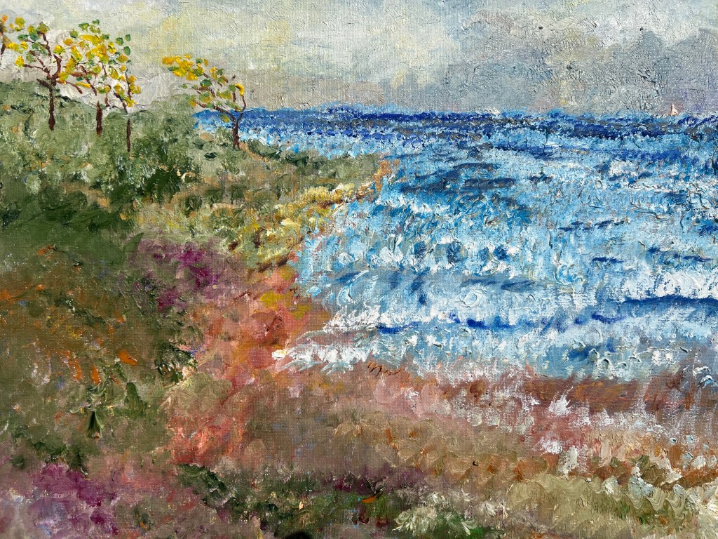 The artist employs a unique painting style, mixing colors directly on the canvas as the work progresses in a multitude of layers, rather than pre-mixing on a palette. Beyond simply layering colors, the dab-dab hand motion creates a dynamic push-and-pull effect between adjacent wet paint hues as it moves across the surface. The resulting colors in the finished pieces are rich and textured. Even within paintings of stormy seas – there is a common sense of a comfort and peace as scenes trigger memories of a unique place or time. The same with vista views, or meadows and valleys.