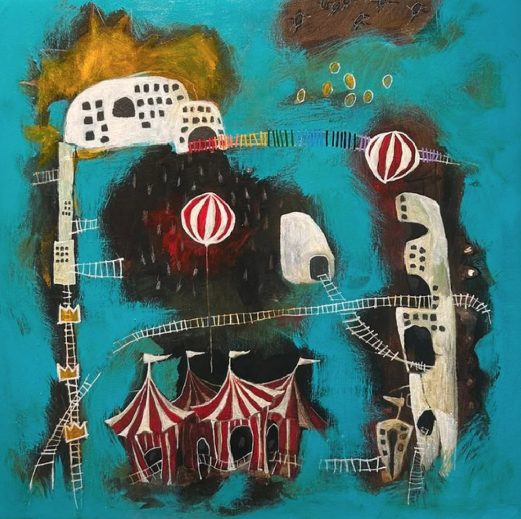Babs acrylic paintings display her love of modern/pop combined with science, Seattle architecture, math, high tech, and English slang words.